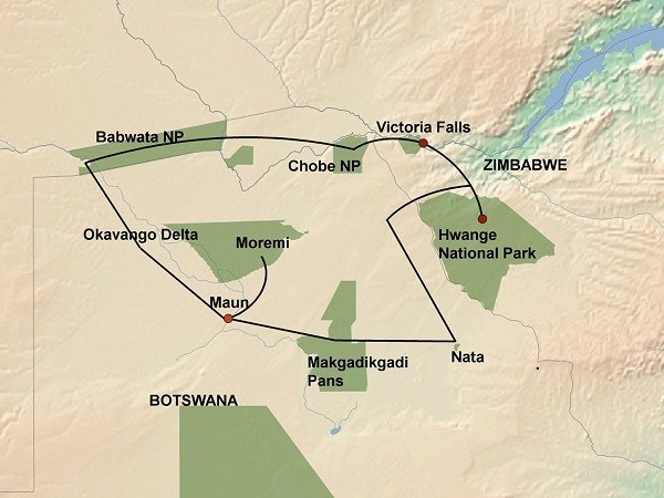 This wildlife safari begins and end in Victoria Falls in Zimbabwe. It includes the Victoria Falls, Magkadigkadi Pans, Chobe Game Reserve, Western Caprivi and the Okavango Delta.